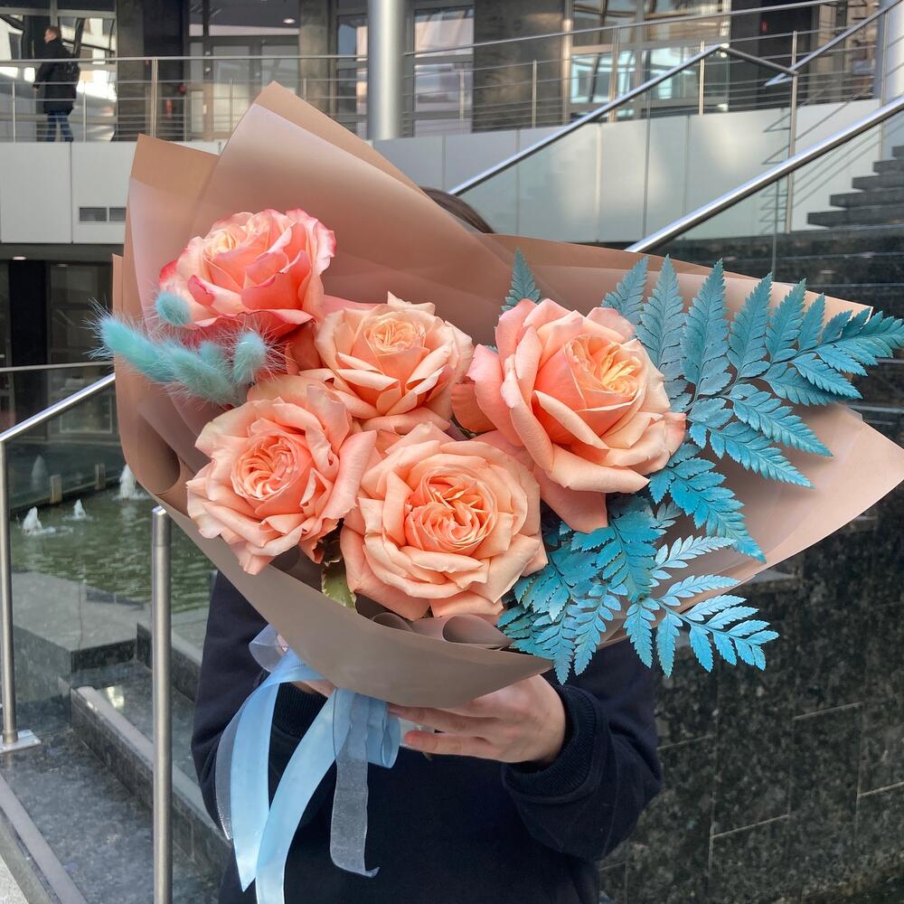 Роза – 5 шт.Лагурус – 5 шт.Папоротник – 2 шт.Лента – 2 шт.Упаковка дизайнерская – 2 шт.