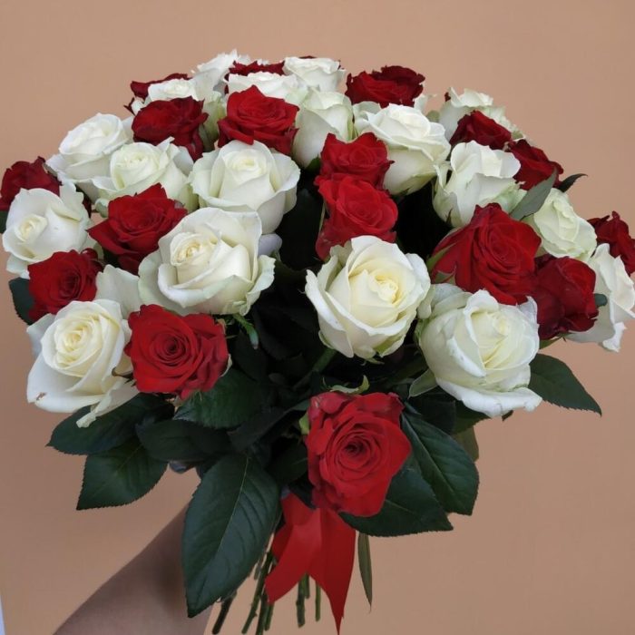 роза украинская красная – 19 шт. роза украинская белая – 20 шт. Оформление лента атласная – 1 шт.