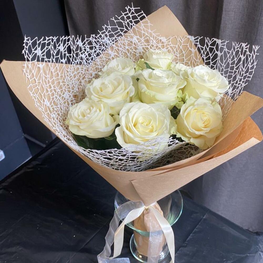 Роза белая мондиаль – 9 шт.Лента атласная кремовая – 1 шт.бумага крафт – 1 шт.сетка ажурная – 1 шт.