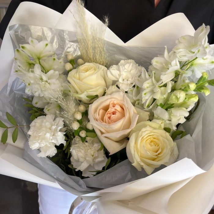 white o’hara – 1 шт.Роза одноголовая – 2 шт.Дельфиниум – 2 шт.антиринум – 1 шт.Гиперикум – 2 шт.Диантус – 3 шт.Сухоцветы – 2 шт.Фисташка – 3 шт.