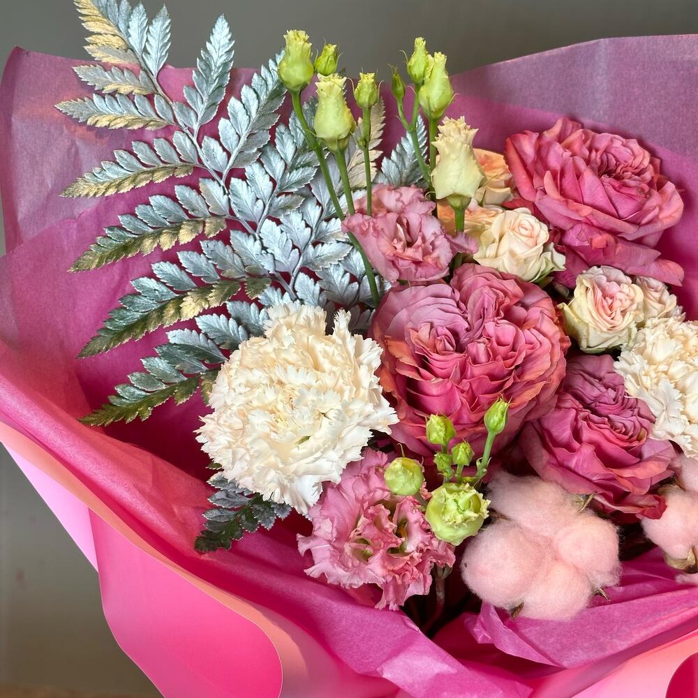 Букет с хлопком и пионовидными розами
