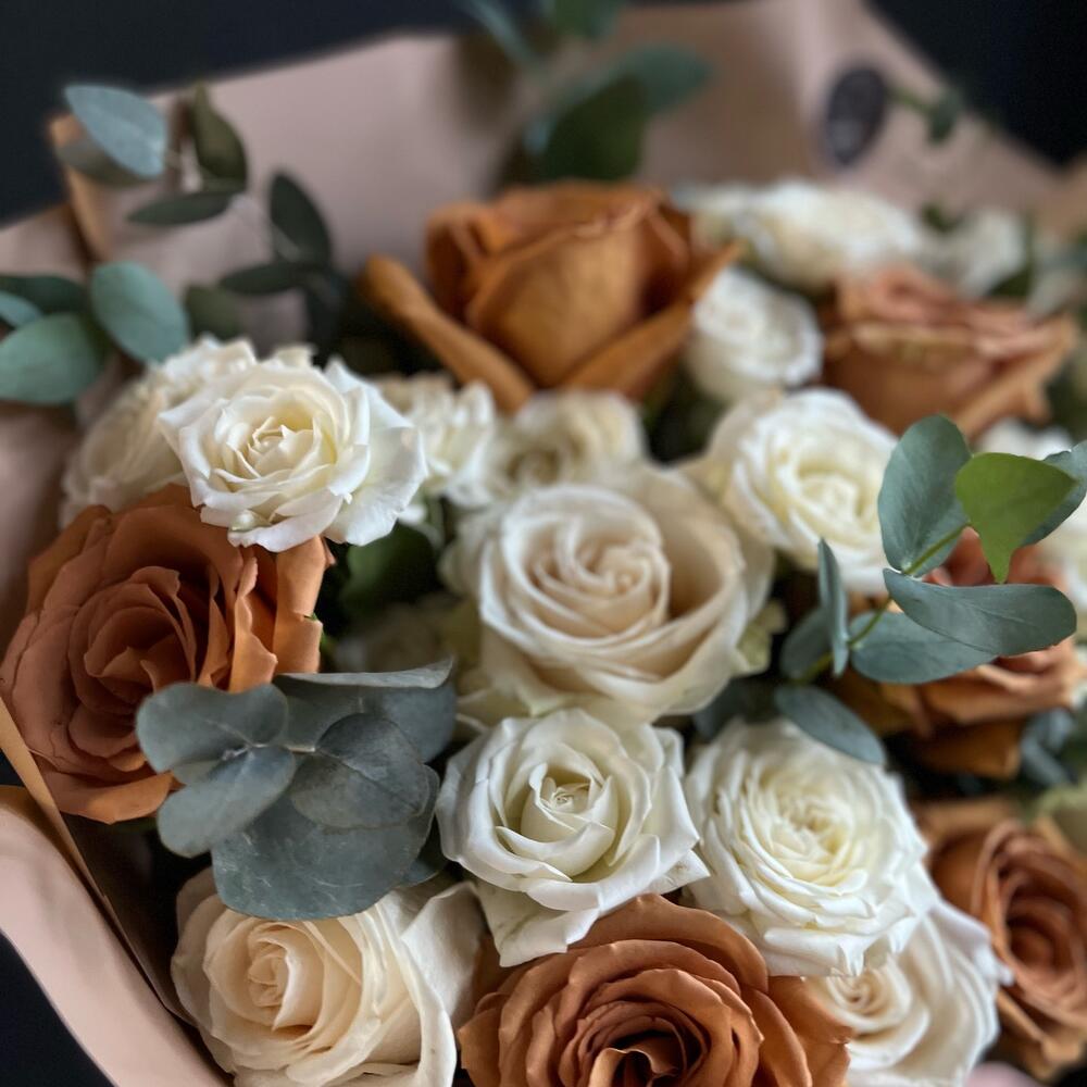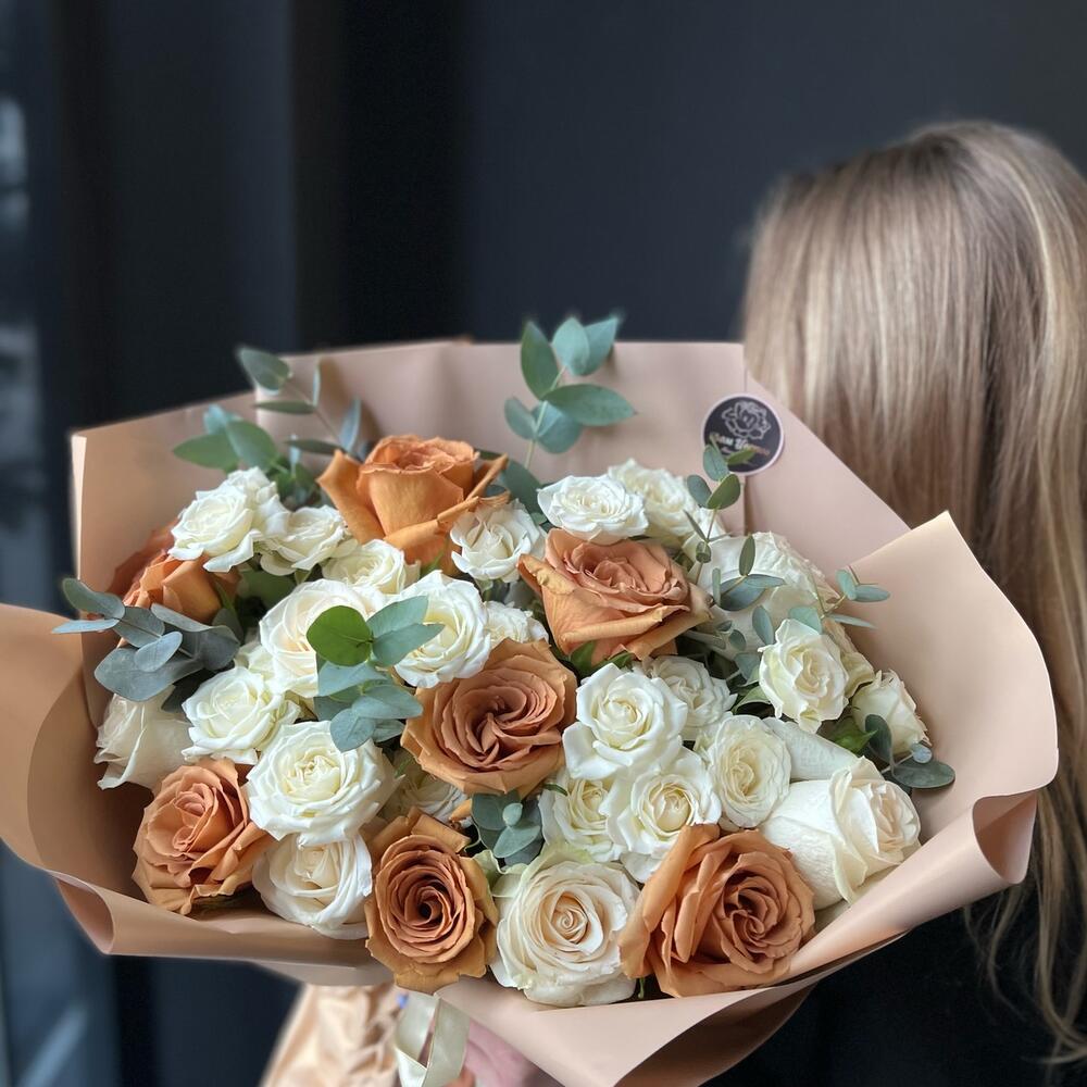 Одноголовая роза – 6 шт.Кустовая роза – 6 шт.роза тоффи – 7 шт.Эвкалипт – 8 шт.декоративная упаковка – 1 шт.Атласная лента – 1 шт.