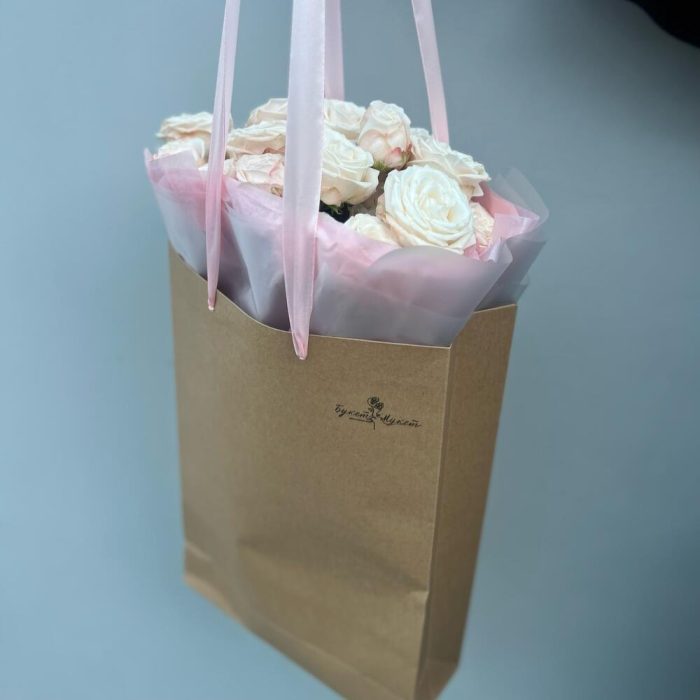 Роза кустовая Бомбастик – 5 шт.Лента атласная – 1 шт.Тишью – 2 шт.Пленка матовая – 1 шт.