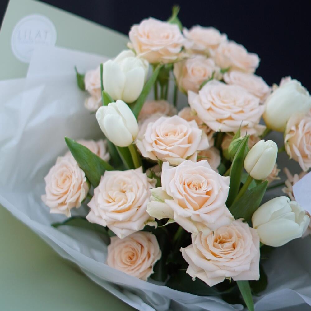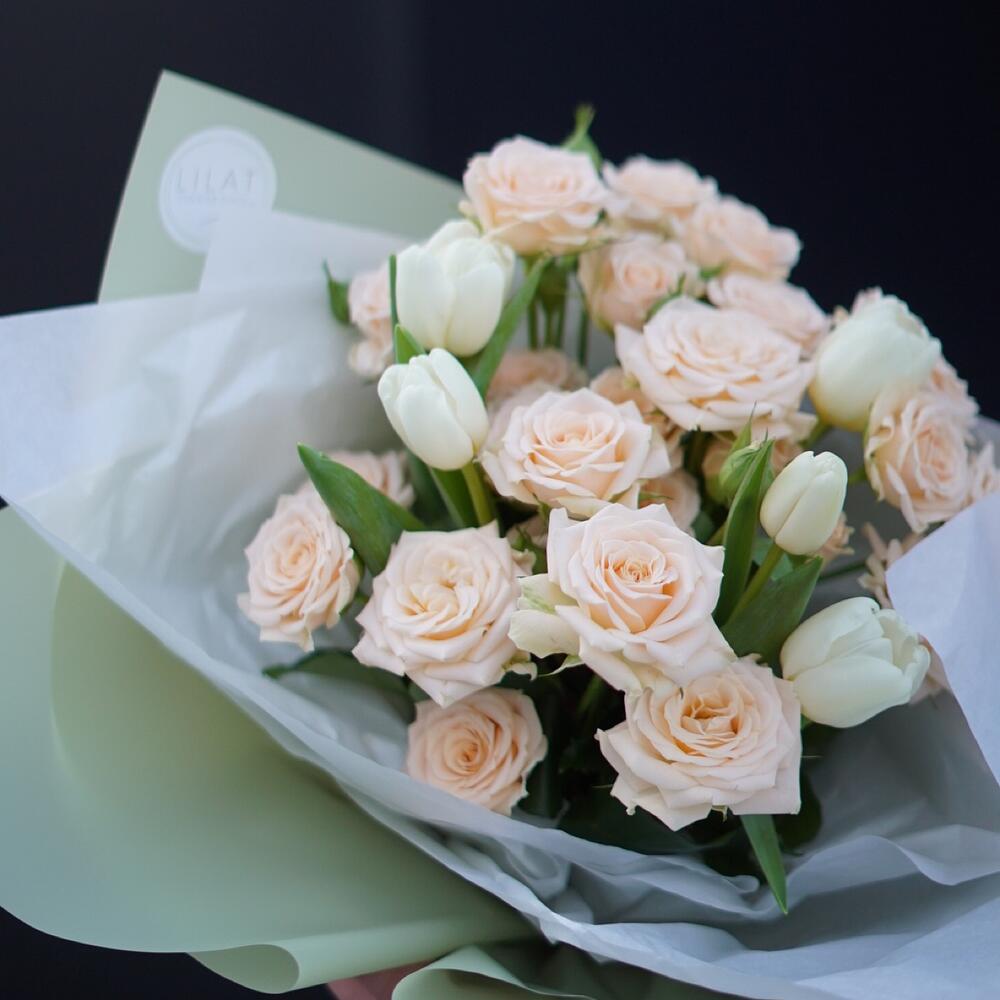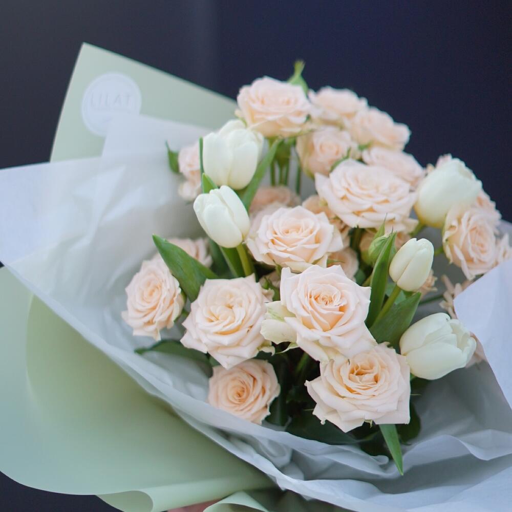 Кремовая кустовая роза – 7 шт. Тюльпан – 5 шт. Дизайнерская упаковка – 1 шт. Открыточка с вашими пожеланиями – 1 шт. инструкция по уходу за цветами – 1 шт.