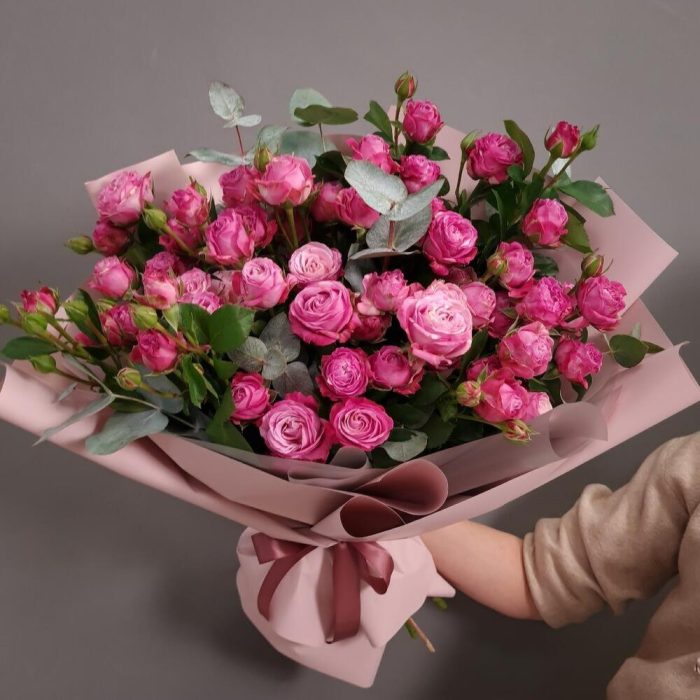 Ярко-розовые стойкие пионовидные кустовые розы Леди Бомбастик и ароматный эвкалипт.