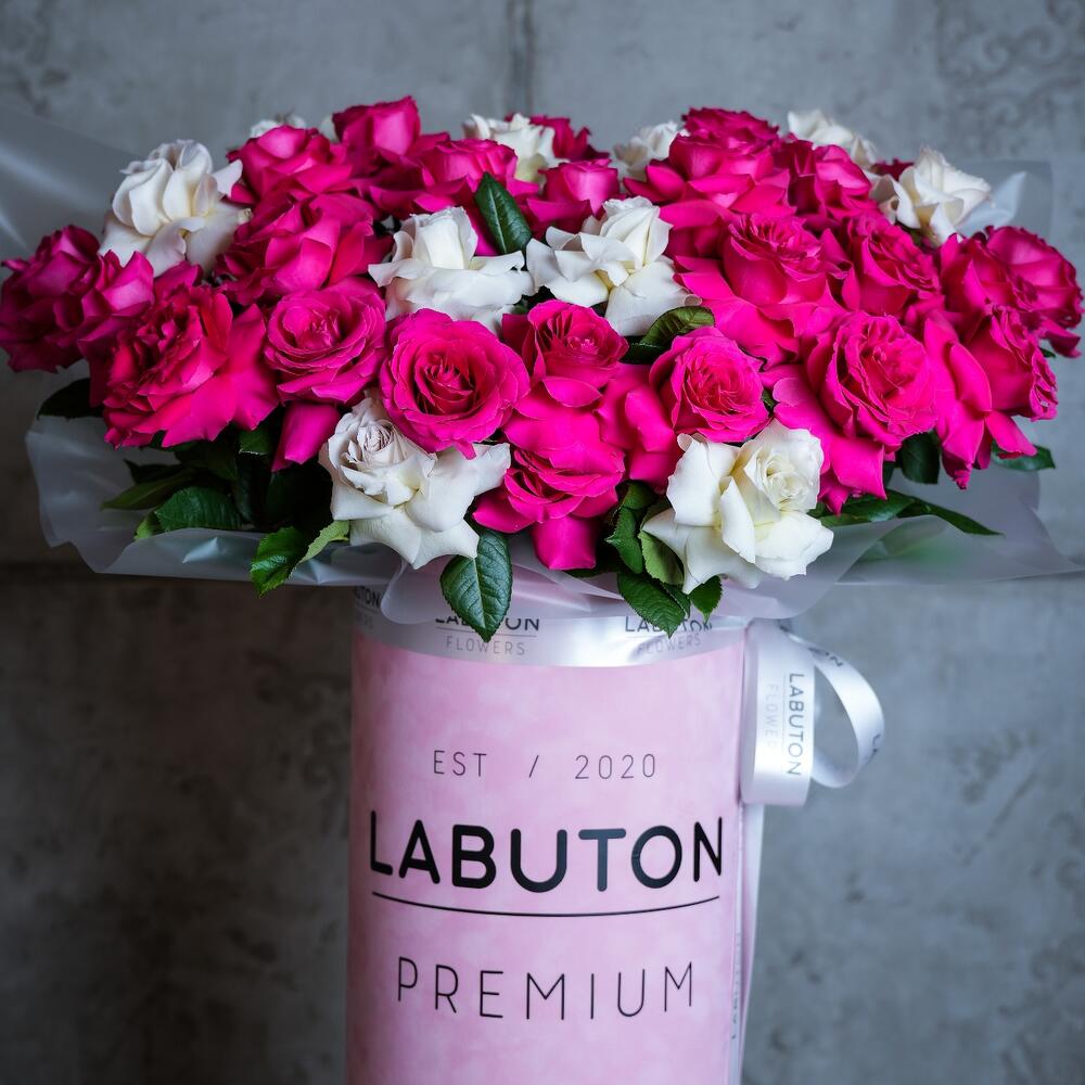 роза с французским раскрытием – 35 шт. Коробка – 1 шт. Оазис флористический – 3 шт.