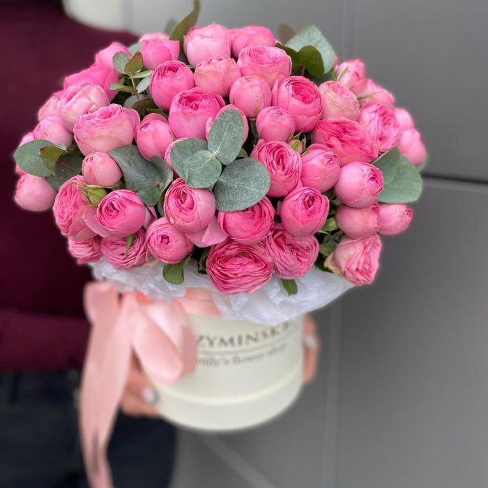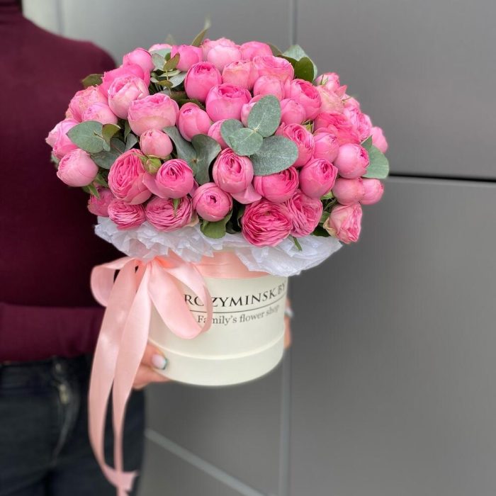 Композиция в шляпной коробке с пионовидными кустовыми розами сорта Жизель