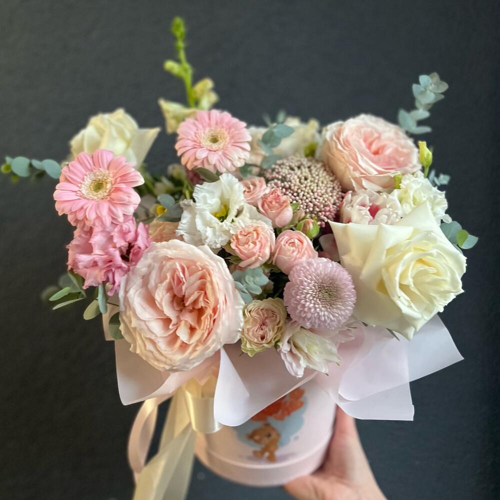 Пионовидная роза – 5 шт.Кустовая роза – 3 шт.тюльпаны – 3 шт.Хризантема – 2 шт.Гербера – 3 шт.Лизиантус – 4 шт.Озотамнус – 2 шт.антиринум – 2 шт.Эвкалипт – 3 шт.Шляпная коробка – 1 шт.Флористическая губка (оазис) – 1 шт.Атласная лента – 1 шт.
