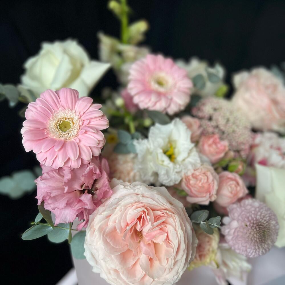 Цветы в коробке из пионовидных роз,Хризантемы и Гербер