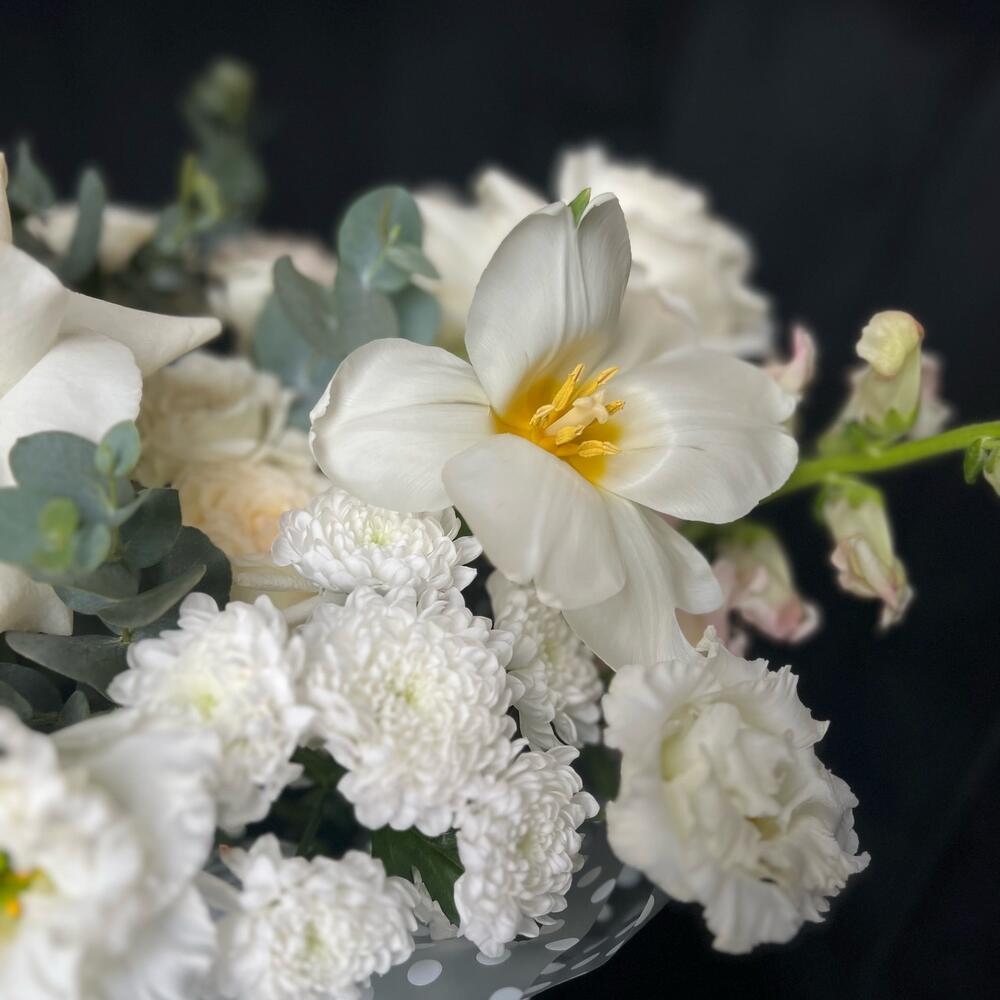 Роза одноголовая – 5 шт.Тюльпан – 3 шт.Кустовая роза – 3 шт.Хризантема кустовая – 4 шт.Эустома – 4 шт.антиринум – 2 шт.Эвкалипт – 3 шт.Коробка шляпная – 1 шт.Флористическая губка (оазис) – 1 шт.Атласная лента – 1 шт.