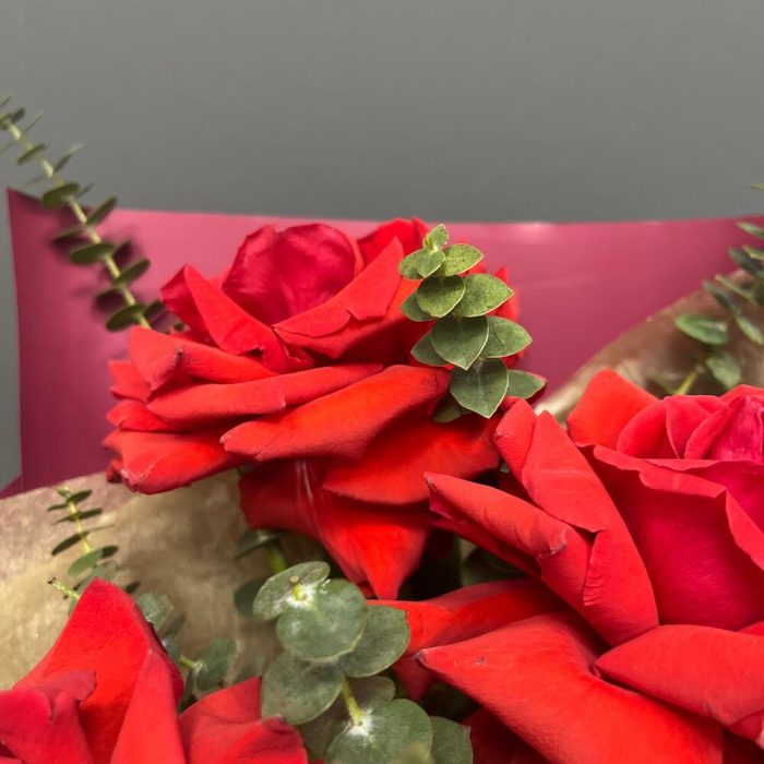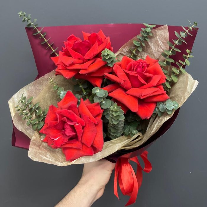 Лента атласная – 1 шт.Тишью – 1 шт.Эвкалипт Baby Blue – 3 шт.Упаковка корейская пленка – 1 шт.роза французская алая нина – 3 шт.