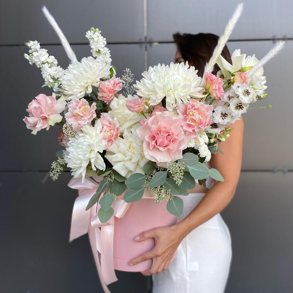 Хризантема одноголовая – 3 шт.Роза Эквадор – 7 шт.матиолы – 3 шт.Лизиантус – 2 шт.Гвоздика – 5 шт.Хризантема кустовая – 2 шт.Озотамнус – 1 шт.пампасная трава – 3 шт.