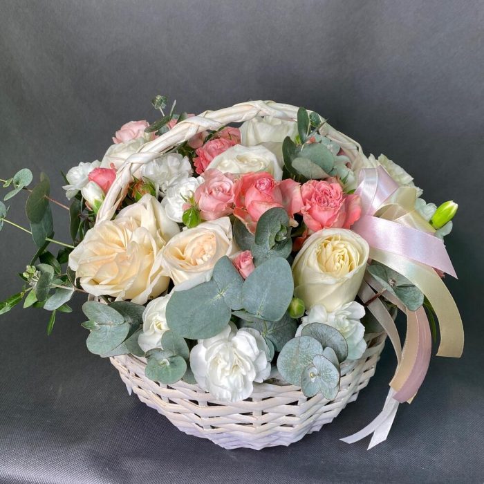 Корзина плетёная с белыми розами
