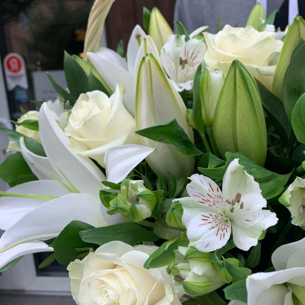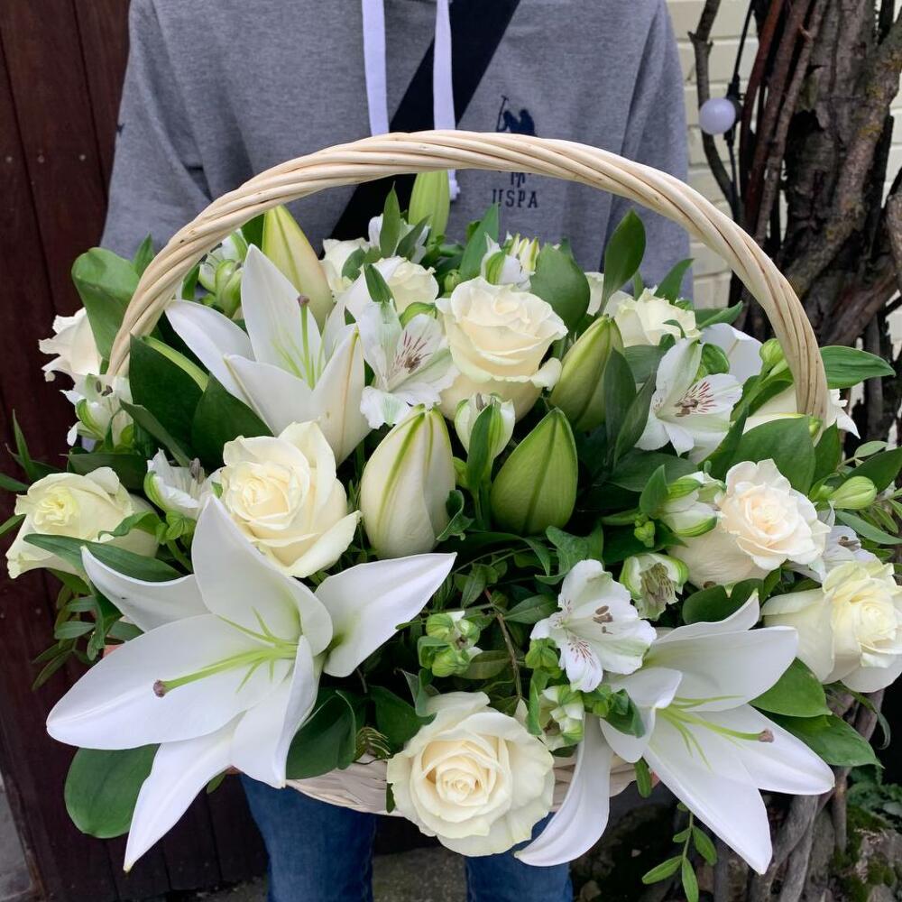 Корзина с лилией, белыми розами, альстромерией и декоративной зеленью «Весенний сад»