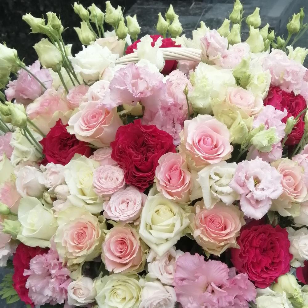 Роза – 25 шт.Роза кустовая – 17 шт.Роза пионовидная – 10 шт.Эустома – 10 шт.Гвоздика – 10 шт.Эвкалипт – 15 шт.Корзина – 1 шт.Оазис – 2 шт.
