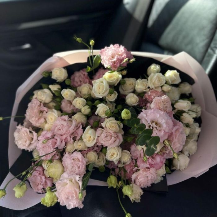 Альстромерии, Гвоздики, Кустовые розы, Лизиантусы, Розы, Хризантемы