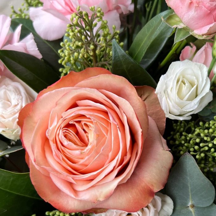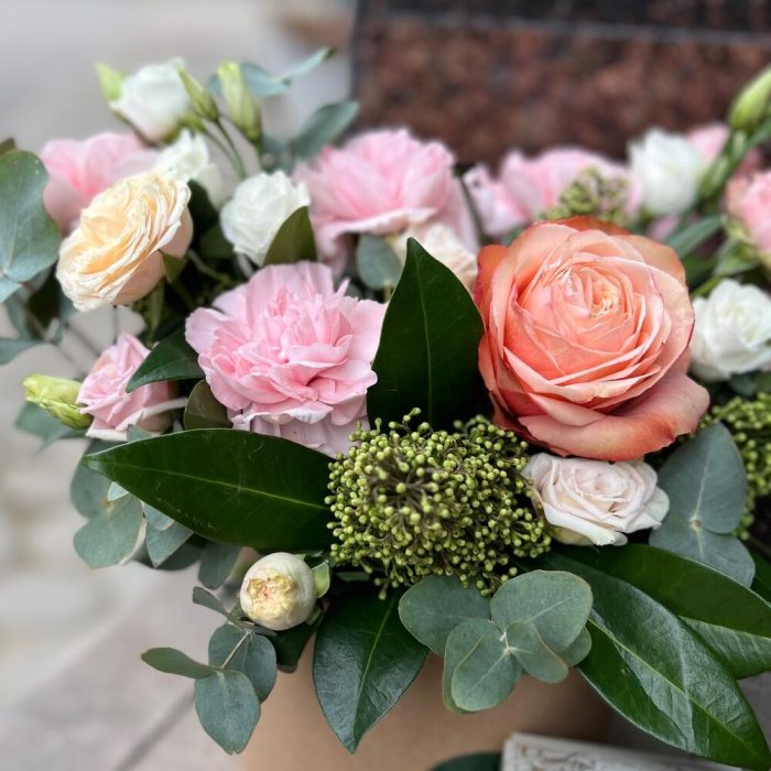 Лизиантус – 1 шт.Роза кустовая – 1 шт.Эвкалипт – 3 шт.Роза Эквадор – 1 шт.Шляпная коробка – 1 шт.Скиммия – 3 шт.Оазис флористический – 1 шт.Диантус сортовой – 4 шт.печенье «счастье» ангел – 1 шт.