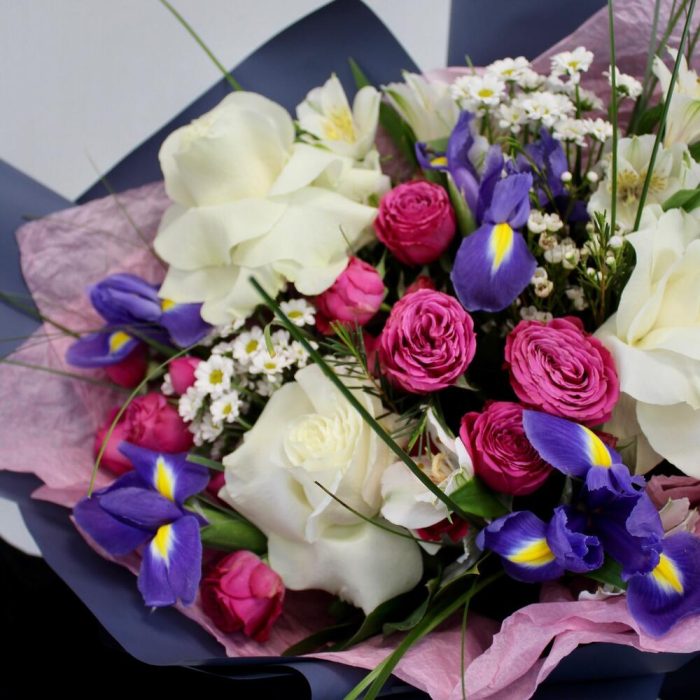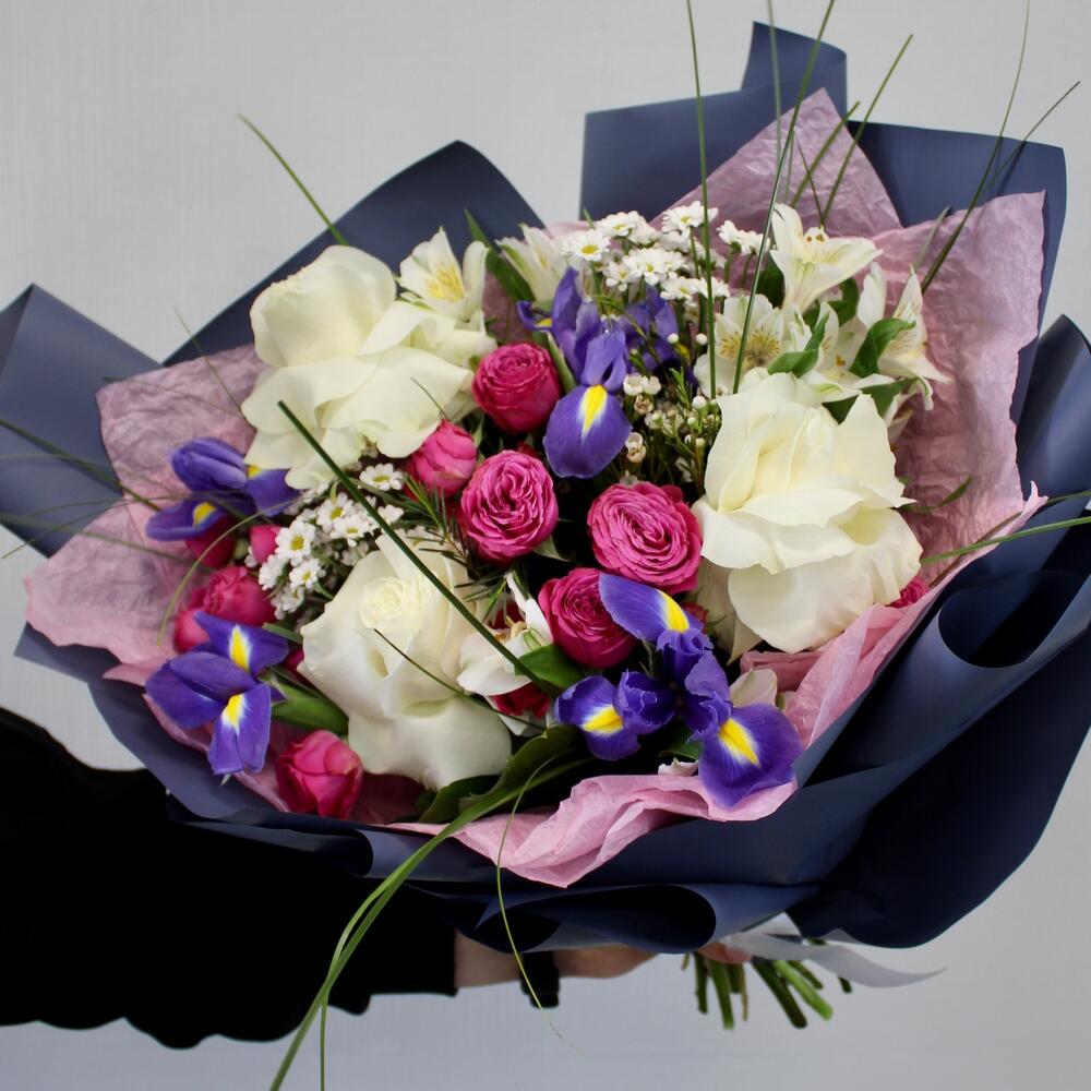 ирисы – 4 шт.Роза кустовая – 4 шт.роза вывернутая – 3 шт.Сантини – 2 шт.Ваксфлауэр – 1 шт.Рускус – 1 шт.Упаковка дизайнерская – 4 шт.