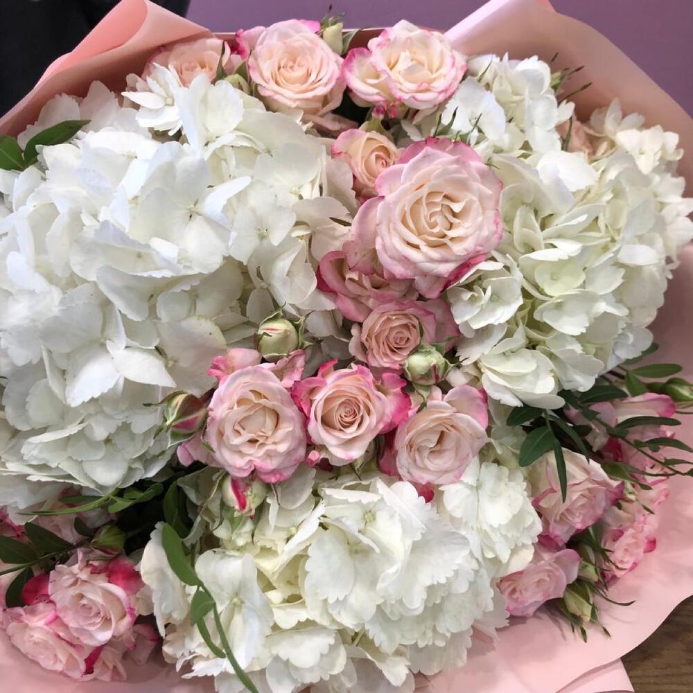 Гортензия – 3 шт.Роза кустовая – 4 шт.Упаковка корейская пленка – 4 шт.бант атласный – 1 шт.