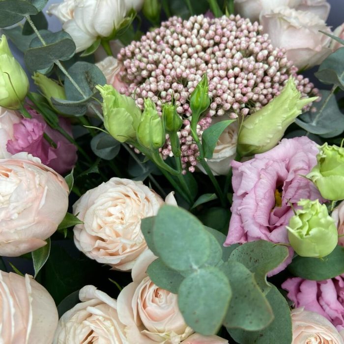 Роза кустовая – 4 шт.Эустома – 3 шт.Озотамнус – 1 шт.Эвкалипт – 3 шт.Корейская упаковка – 1 шт.бант атласный – 1 шт.