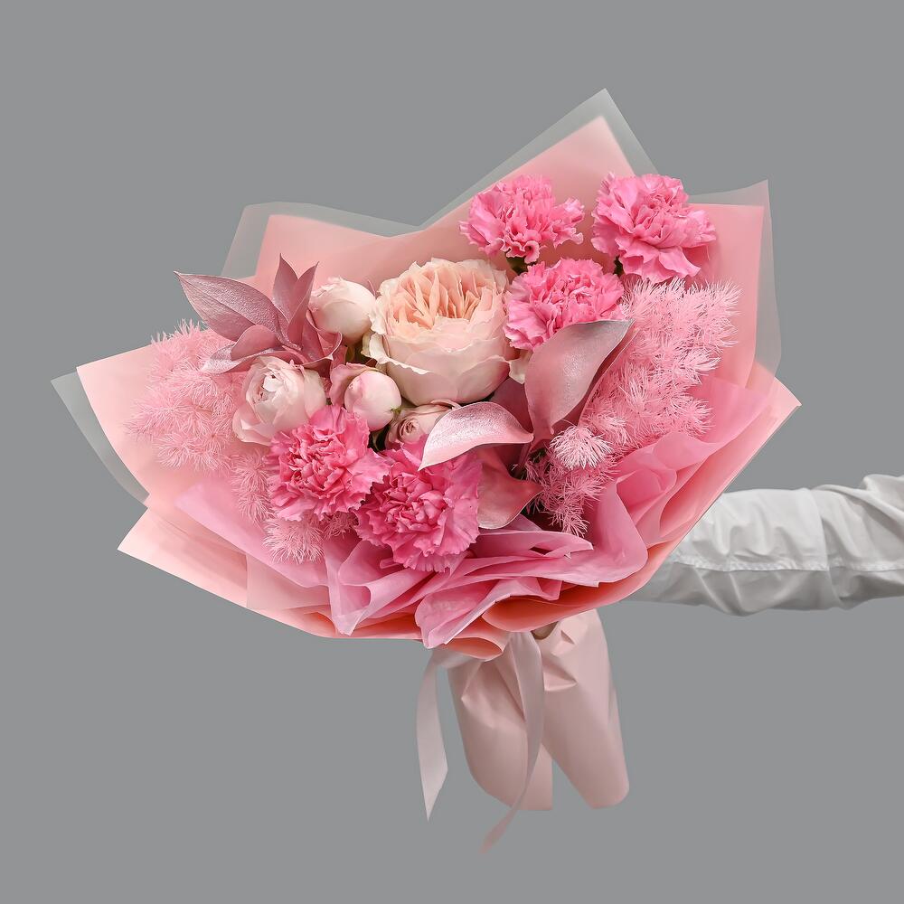 Нежный букет в розовой цветовой гамме. В составе пионовидная роза, кустовая пионовидная роза, похожая на пион, и сортовая гвоздика.Флористы студии Цветочный Этикет собрали его из самых свежих цветов, тщательно продумав состав. Букет готов удивлять красотой своего получателя! … Показать ещёСтанет идеальным подарком для любимой женщины, дочке или мамы, на День Рождения, юбилей, свадьбу и другие торжественные мероприятия. С букетом вы получите конверт с открыткой, в которой мы напишем любое пожелание, инструкцию свежести и средство для продления жизни срезанных цветов.