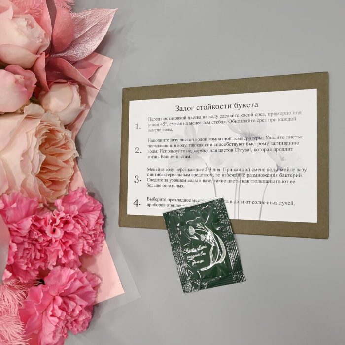 - Сроки возврата: Претензии по качеству букета принимаются в течение 24 часов с момента его получения.