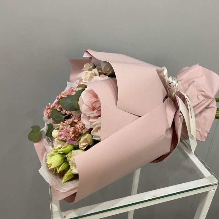 Роза одноголовая – 2 шт.эустома махровая розовая – 1 шт.Эвкалипт – 2 шт.Роза кустовая – 4 шт.Маттиола – 3 шт.Упаковка дизайнерская – 5 шт.Тишью белое – 2 шт.