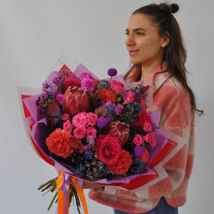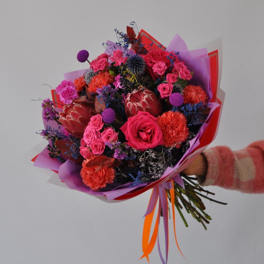 Очень яркий!Необычное сочетание экзотики и классики – протея, колючки, розы и гвоздики.Необычный букет для вашего получателя!Станет прекрасным подарком на день рождения, юбилей. Яркие краски как никогда лучше подходят для дарения в это время года)