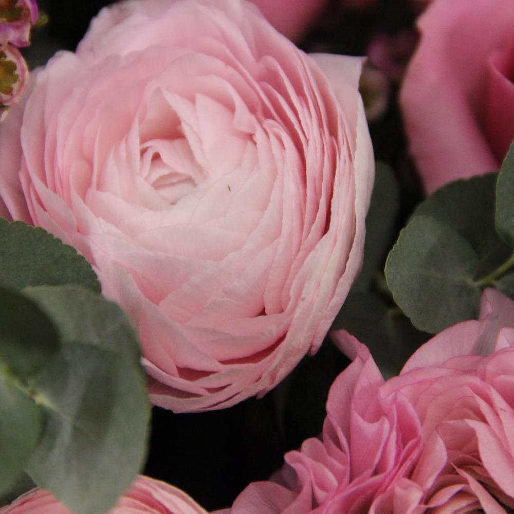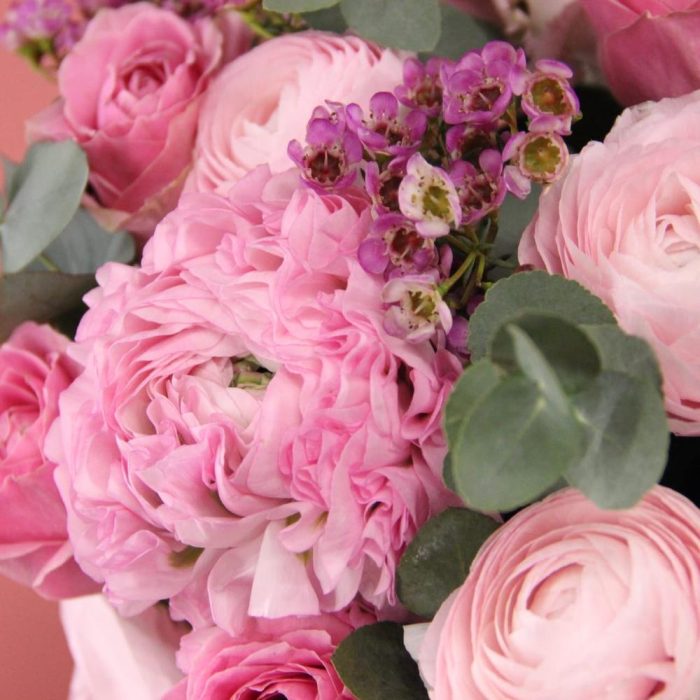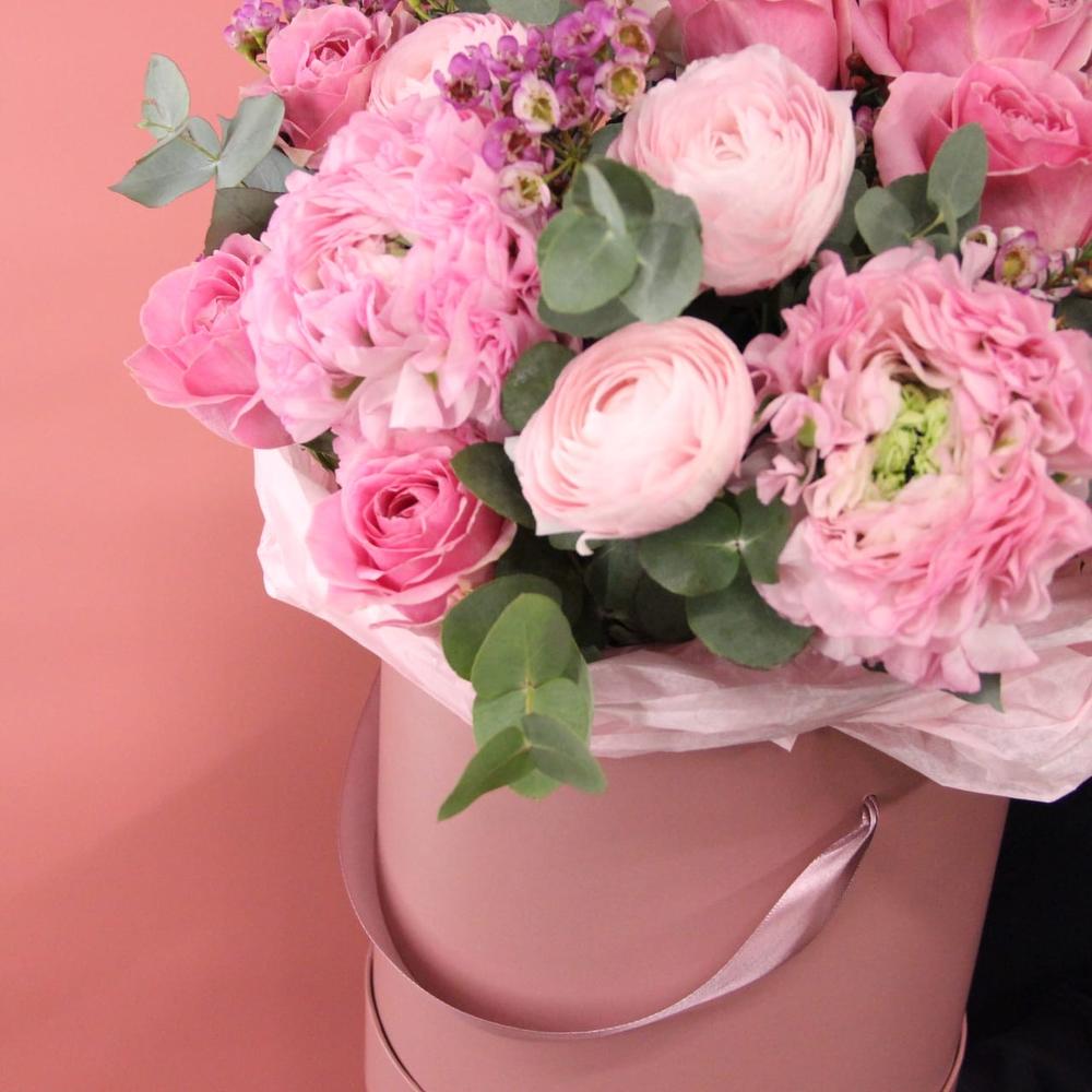 Шляпная коробка с ранункулюсами, розами, лизиантусом, ваксфлауэром, диантусом и эвкалиптом.