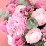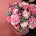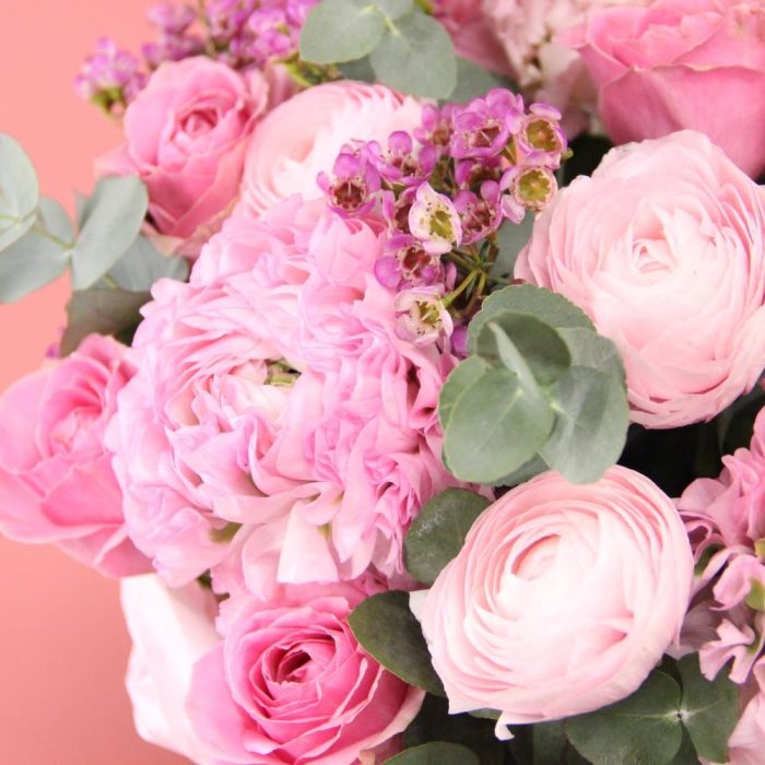 Пион – 3 шт.Роза сортовая – 9 шт.Ранункулюс – 5 шт.Диантус – 5 шт.Ваксфлауэр – 3 шт.Эвкалипт – 7 шт.Коробка шляпная – 1 шт.Оазис – 1 шт.Тишью – 2 шт.