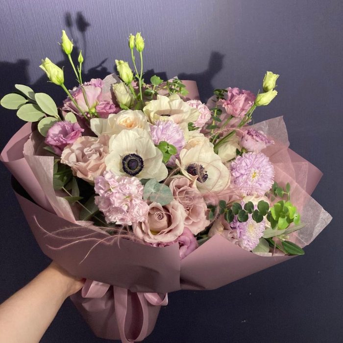 Анемон – 3 шт.Роза пионовидная – 3 шт.Роза Эквадор – 3 шт.Лизиантус – 3 шт.Ковыль – 2 шт.Астра – 3 шт.Маттиола – 2 шт.Эвкалипт – 4 шт.Питтоспорум – 2 шт.Тишью – 2 шт.Упаковка – 2 шт.Лента атласная – 1 шт.