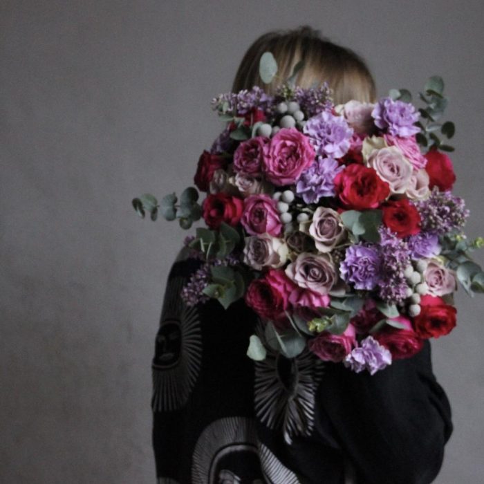 Маттиола – 5 шт.Роза пионовидная – 9 шт.Роза пионовидная кустовая – 5 шт.Роза Эквадор – 9 шт.Бруния – 3 шт.Диантус – 9 шт.Эвкалипт – 11 шт.Фисташка – 5 шт.Лента атласная – 2 шт.Сирень – 3 шт.