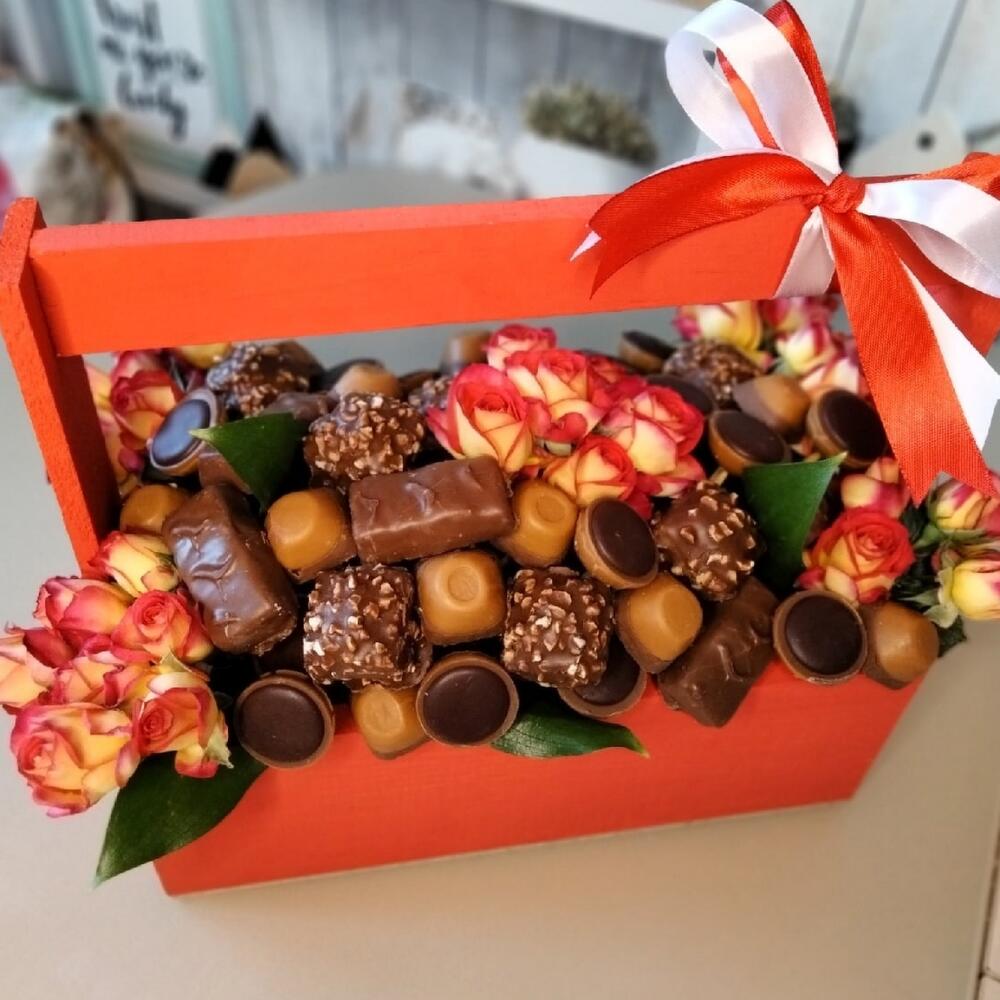 “Сладкое сердце ” – цветочная композиция с сладостями в коробке “Сердце”