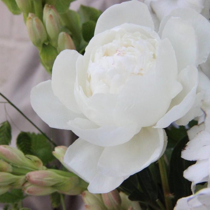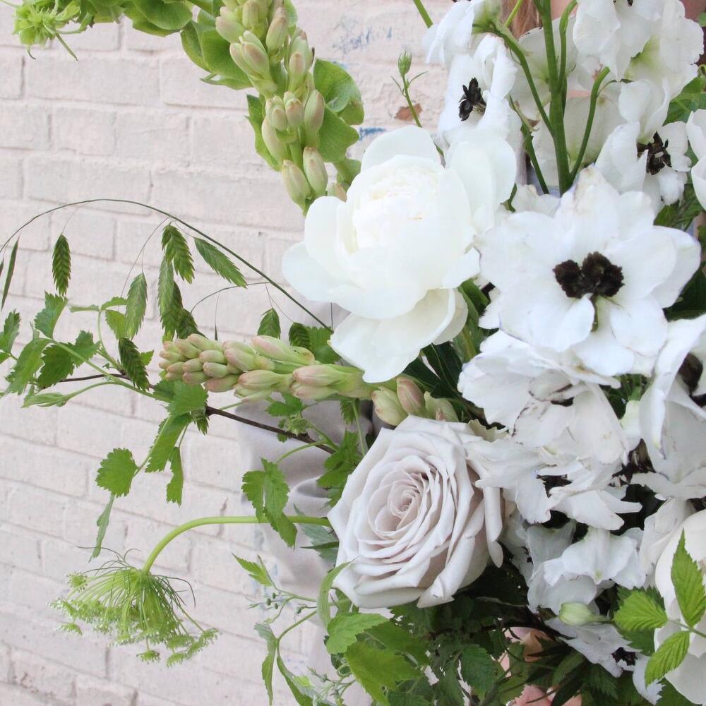 дельфиниумом – 3 шт.Амарант – 1 шт.ирландский колокольчик – 2 шт.Ветки малины – 4 шт.Тубероза – 2 шт.Роза Мента – 2 шт.Пион – 3 шт.Амми – 3 шт.Фисташка – 3 шт.Лента атласная – 1 шт.