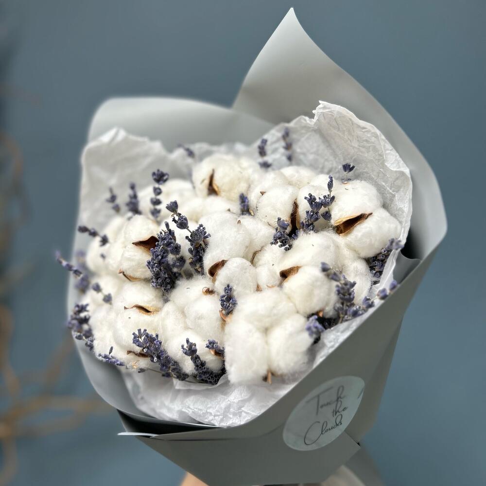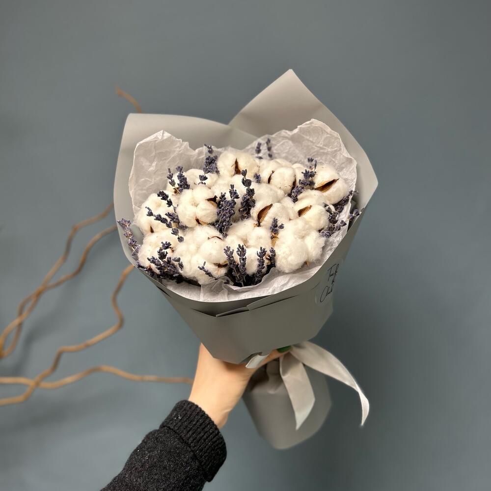 «Лавандовое созвездие» Букет из розы, гвоздики, статица и хлопка