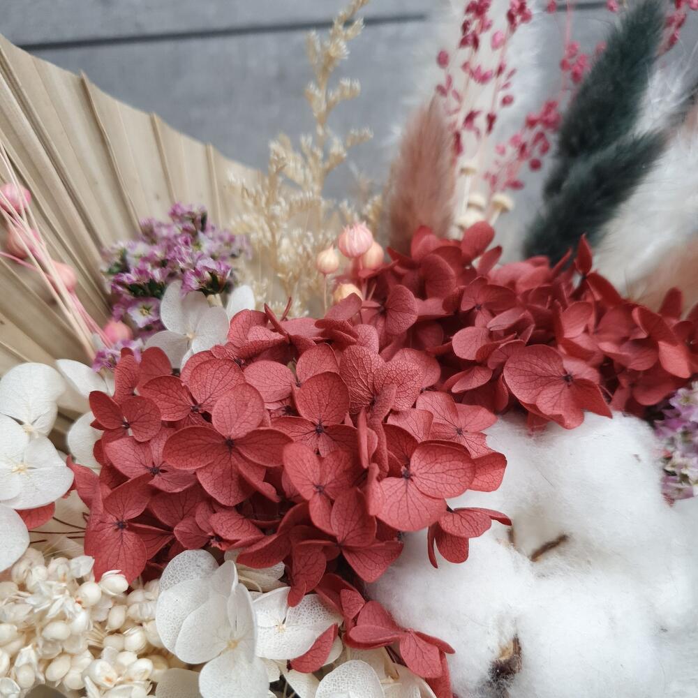 гортензия стабилизированная пучок – 2 шт.мини пампас – 2 шт.Лагурус (сухоцвет) – 5 шт.бриза пучок – 1 шт.Лен – 3 шт.амарант стабилизированный – 1 шт.копье пальмы – 1 шт.сорго – 1 шт.статица стабилизированная – 2 шт.Кермек – 2 шт.Хлопок натуральный – 1 шт.ботао – 6 шт.Кашпо керамическое – 1 шт.