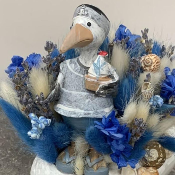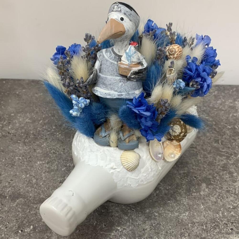 Кашпо керамическое – 1 шт.Фигурка декоративная – 1 шт.Лаванда (сухоцвет) – 30 шт.гортензия стабилизированная – 1 шт.лагурус пучок – 2 шт.Ракушки – 20 шт.